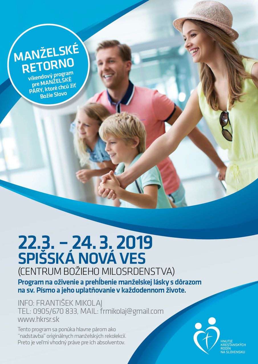 Hnutie kresťanských rodín na Slovensku organizuje v termíne od 22. - 24. 3. 2019 v Centre Božieho milosrdenstva v Spišskej Novej Vsi (pri Svätyni Božieho milosrdenstva) program pre manželské páry "Manželský návrat /Retorno/". Program je zameraný na rozvíjanie manželskej lásky s hlbším zameraním sa na Sv. Písmo a jeho odkaz manželským párom. HKR ponúka tento program všetkým, ktorí by mali oň záujem s možnosťou využiť čas blížiaceho sa pôstneho obdobia na duchovnú obnovu. Potrebné informácie na prihlásenie nájdete na plagáte v prílohe.